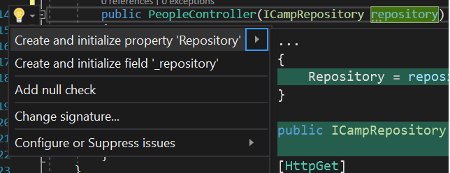 اکنون ، پس از اضافه کردن خودکار کد برجسته شده در بالا توسط Visual Studio ، باید نام را به صورت دستی این.repository به _repository و قسمت فقط خواندنی را به _repository تغییر نام دهید. و مجبورید هر بار این کار را انجام دهید. به هیچ وجه.