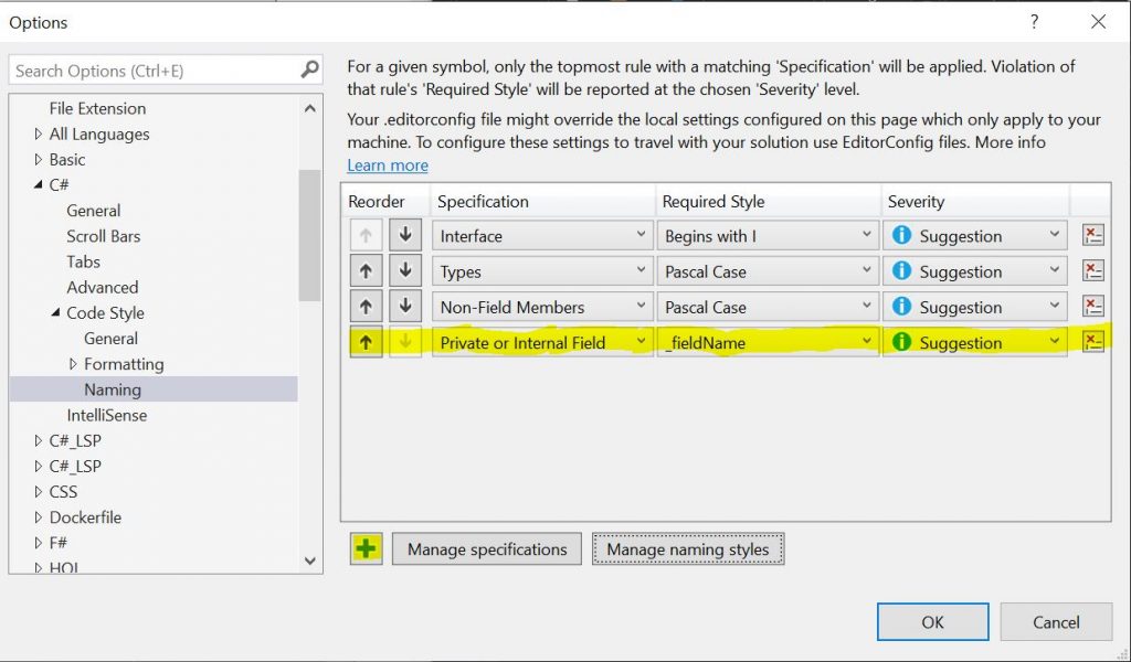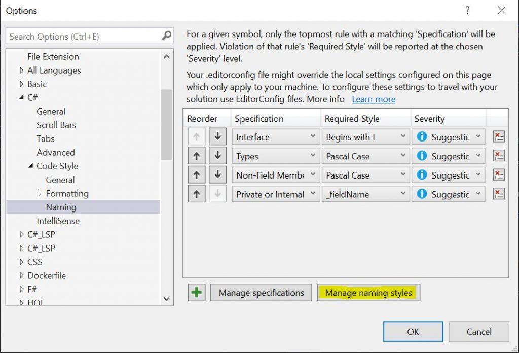 روی ویرایشگر متن / C # / سبک کد / نامگذاری / کلیک کنید] مدیریت سبک های نامگذاری